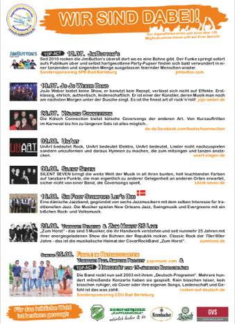 7 Donnerstage, jeweils von 19-22 Uhr, im Rathausgarten. Dank der bewährten Unterstützung der SPD Bad Berleburg starten wir am 12.07. mit einem echten Kracher: die Top-Band JimButton's haben dann ihre Wittgenstein-Premiere. Wir freuen uns auf euch ...