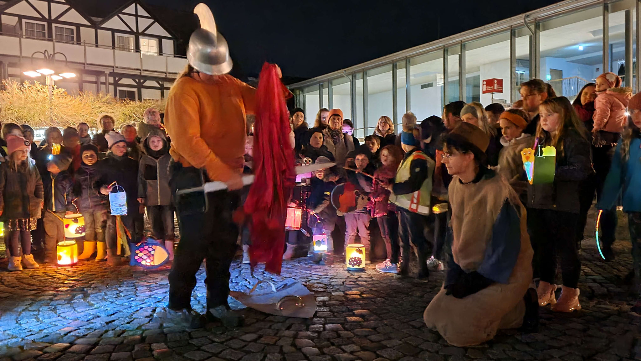 Gleich hunderte junge und alte Menschen sammelten sich mit ihren strahlenden Lichtern für einen kurzen Moment in der Mühlwiese vor dem Friederike-Fliedner-Haus. Untermalt wurde die Zusammenkunft von den traditionellen Liedern zum Martinstag der Bläsertruppe der Musikschule unter der Leitung von Georg Gayer-Oehme. Schließlich ging es in Begleitung von der THW Jugend, dem Deutschen Roten Kreuz und der Polizei langsam zum Marktplatz, angeführt vom heiligen Sankt Martin auf seinem Pferd, welcher in diesem Jahr von Jacqueline Sonneborn gespielt wurde. Auf die obligatorische Mantelteilung mit dem Bettler (Marlies Zode) auf dem Marktplatz folgte natürlich die langersehnte Verteilung von hunderten Stutenmännern. Neben der Bäckerei Eckhardt für die rund 600 Stutenmänner bedanken sich der Jugendförderverein und die Stadtjugendpflege bei den Sponsoren 3F Großhandel, Sparkasse Wittgenstein, Volksbank Wittgenstein und Westenergie für die großzügige Unterstützung.
